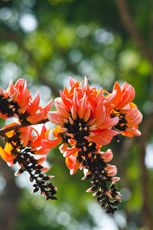 Beautiful orange flowers Blooming, Bastard Teak, Butea monosperma close up on green blur background.