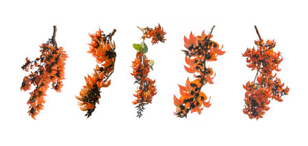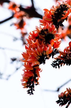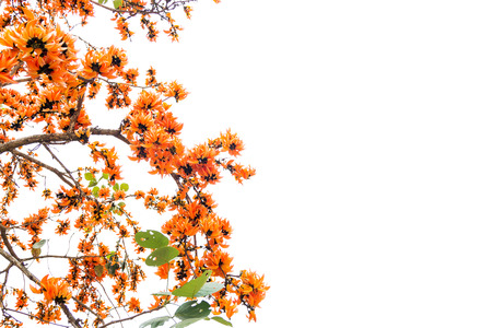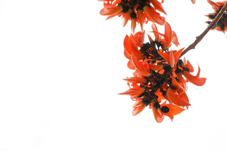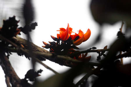 Bastard Teak or Flame of the Forest flower with flare light, soft focus on white background.