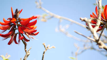 Coral tree red flower in garden, California USA. Erythrina flame tree springtime bloom, romantic botanical atmosphere, delicate exotic tropical blossom. Spring flamboyant colors. Soft blur freshness.