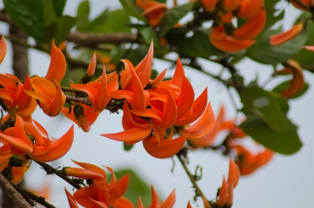 In springtime, there are lots of Palash flowers (Butea Monosperma) blossom on the branches of Palash trees.
