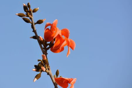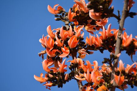 Closeup views of the flame of the forest (Butea monosperma) in full bloom. Palash flowers (Butea Monosperma) blossom on the branches of Palash trees.