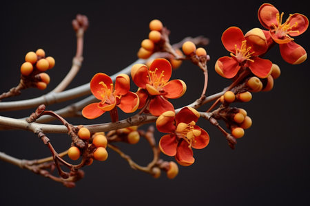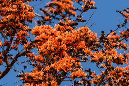 Orange blossoms of Erythrina edulis in a park during a sunny day in the winter. Branch without leaves. Lanzarote, Canary Islands, Spain.