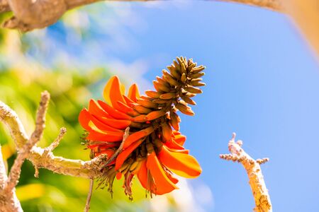 Orange blossoms of Erythrina edulis in a park during a sunny day in the winter. Branch without leaves. Lanzarote, Canary Islands, Spain.