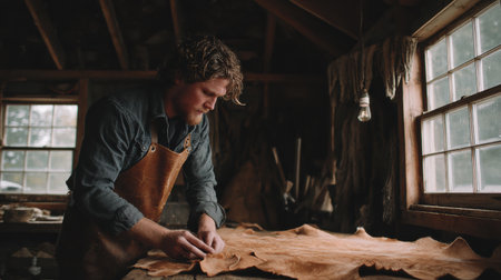 Man carefully inspects and prepares leather pieces in a cozy workshop filled with natural light, showcasing craftsmanship and dedication to artistry.