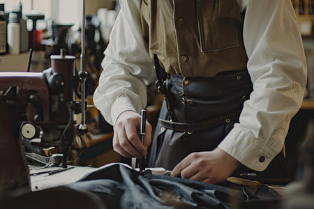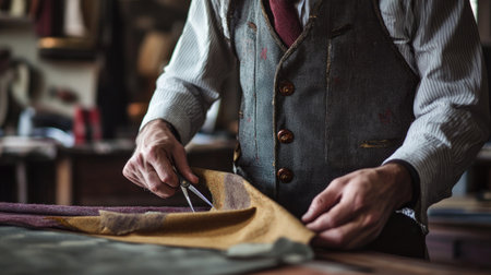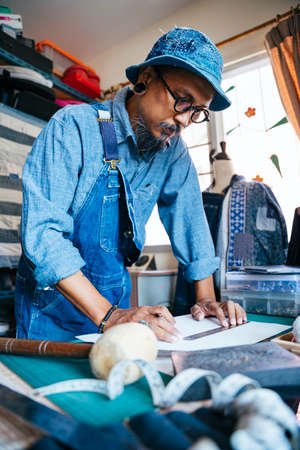 Tailor cutting fabric patterns for clothing design in a fashion studio, with tools spread around.