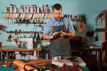 hobby became a small business leather man in apron is making a leather wallet and shooes in studio