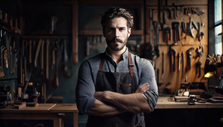 Portrait of a handsome craftsman standing with arms crossed in his workshop