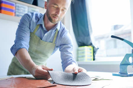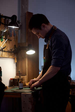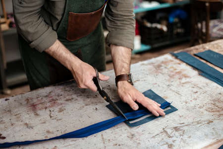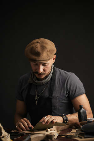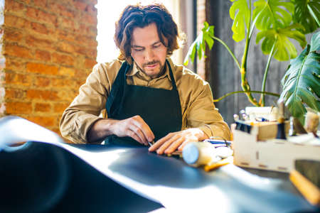 Man works in a bag making studio. Tailor in apron working with leather at workshop.