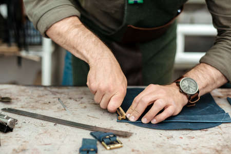 A master workes with details for future goods from natural leather