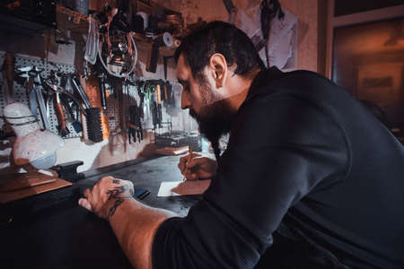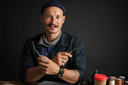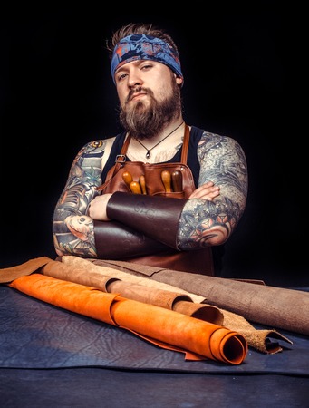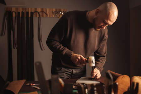Portrait of handsome tanner man at work, small business, authentic workshop, indoors. knocks with hammer