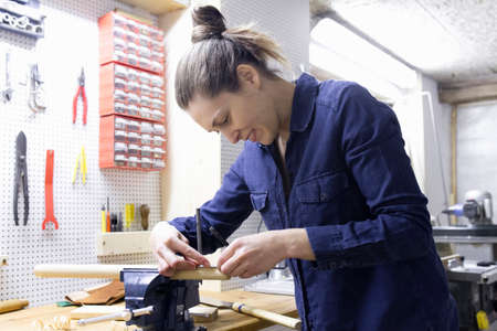 Young female carpenter measuring timber in workshop vice
