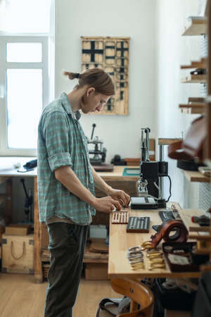 Closeup craftsman hands typing text for branding leather with personal stamp. Creating craft label