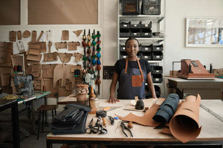 Young African female leather worker standing by a workbench