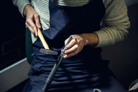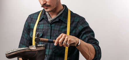 Cropped view of unrecognizable shoemaker with measuring tape and hammer, performs handmade shoes in the studio craft
