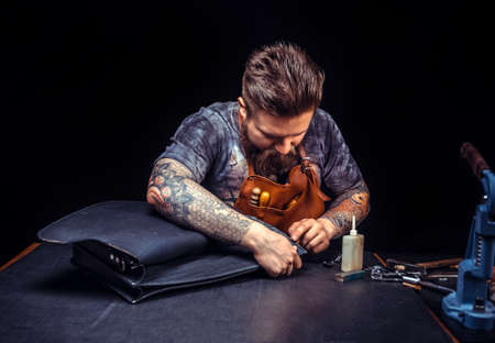 Man working with leather creates quality product of leather at the shop
