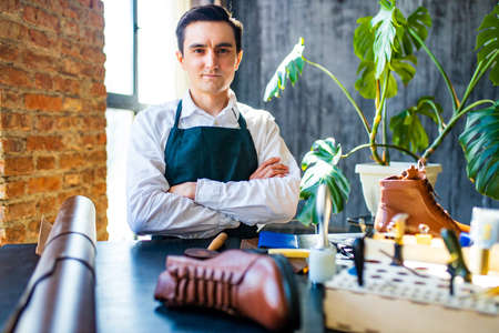 shoemaker man working in his shoe shop