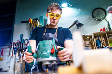 Carpenter young working with wood in workshop