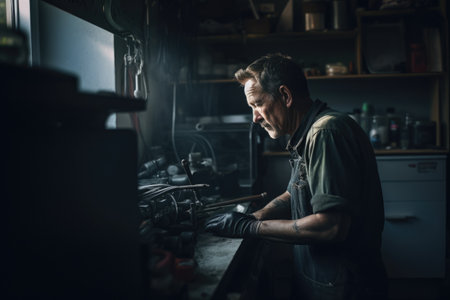 Male Caucasian Middle aged fixing appliances in garage workshop. Generative AI AIG23.