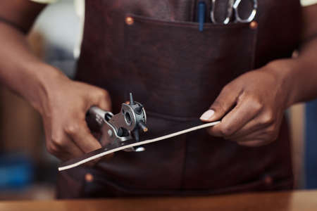 Close up of female artisan punching holes in handmade belt in leatherworking shop, copy space