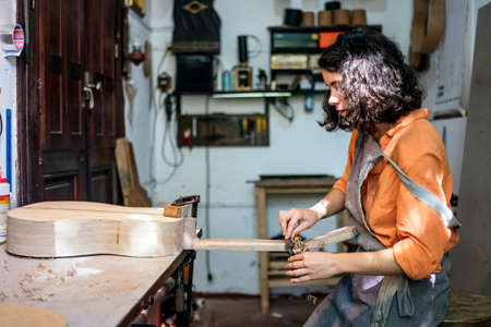 woman luthier making guitars in her musical instrument workshop
