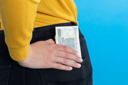 girl puts money in a pocket of jeans back paper bills 200 and 2000 rubles