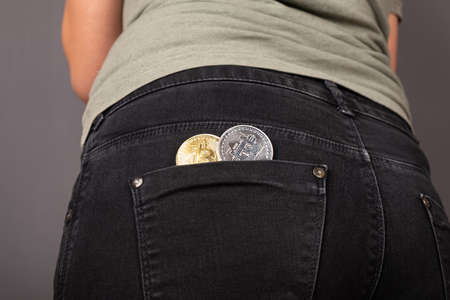 cryptocurrency bitcoin coins in female back pocket