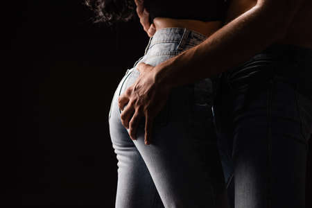 Cropped view of man touching butt of girlfriend in jeans isolated on black