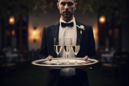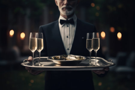 a waiter in a suit stands with a tray on which there are two glasses of champagne for guests of a luxury restaurant