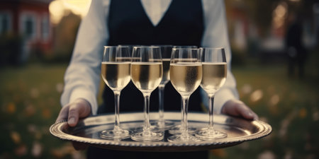 Waiter serving champagne at restaurant. Close-up of waiter holding tray with glasses of champagne.