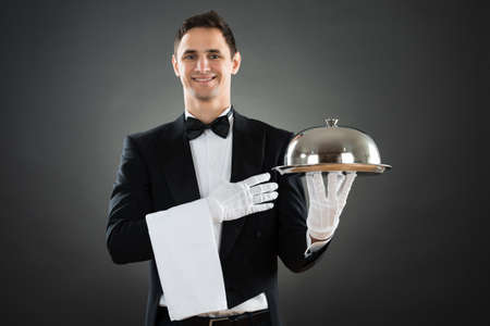 The waiter with tray and metal cloche lid cover