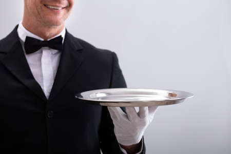 A male waiter in a white shirt and white gloves stands with a silver tray. The concept of service personnel serving customers in a restaurant