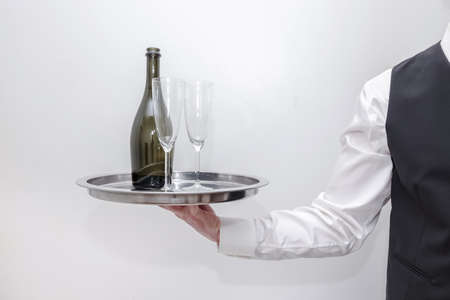 A waiter / butler in white shirt and black suit vest carrying an silver tray with a bottle of champagne and two glasses. White background.