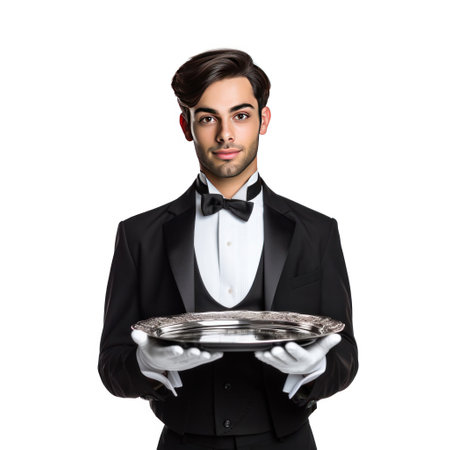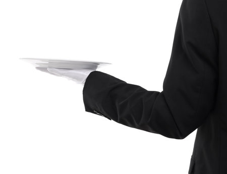 Waiter holding a silver tray with both hands on white background