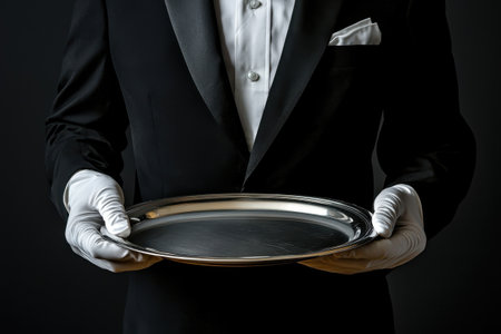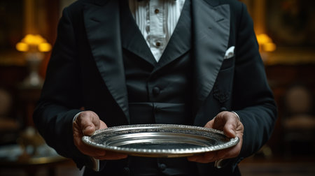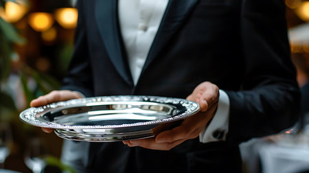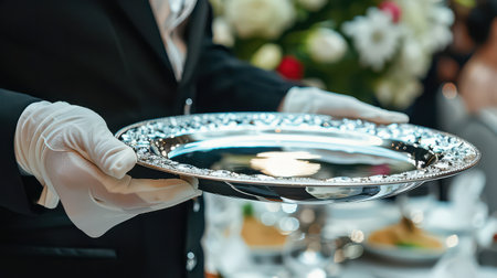 A refined silver serving tray is carefully presented by a waiter in formal black attire and white gloves, epitomizing elegance and professionalism in hospitality settings.