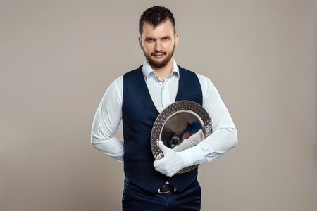 Handsome male waiter, white shirt, holds a silver tray, hand behind his back. Concept of wait staff serving customers in a restaurant