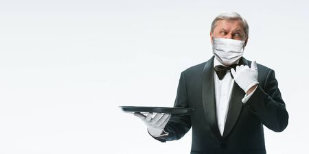 Emotional. Elegance senior man waiter in protective face mask on white background. Flyer with copyspace. Cafe, restaurant opening. Safety during coronavirus pandemic. Taking care of guests and clients.