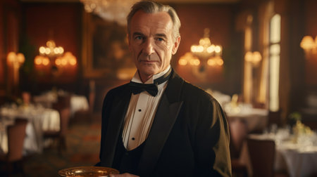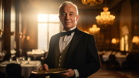 Seasoned waiter in black vest holds silver tray in grand dining room