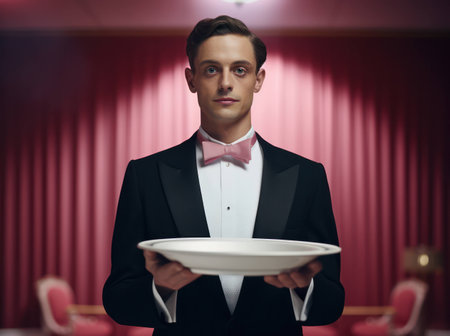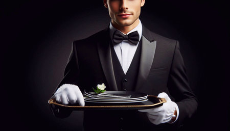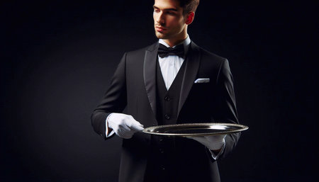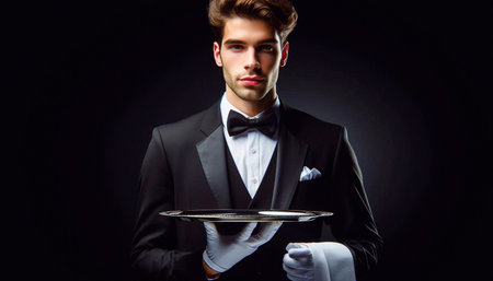 A waiter dressed in a classic tuxedo and white gloves stands against a dark backdrop. He holds a polished silver tray, ready to serve guests at a sophisticated dinner event. The atmosphere exudes elegance and professionalism.
