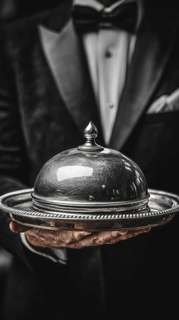 A well-dressed server in formal attire holds a silver cloche, poised to reveal an exquisite dish at an upscale gathering during evening hours, exuding sophistication and style.