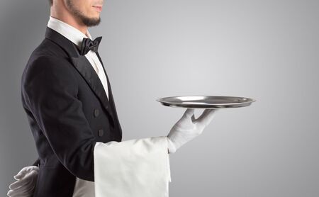 Closeup of young waiter in tuxedo holding metal empty tray and napkin
