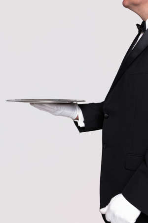 Side view of a butler holding a silver serving tray, blank background to add your own product.