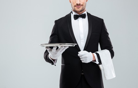 A handsome yong waiter in tuxedo and gloves holding empty tray on white background.