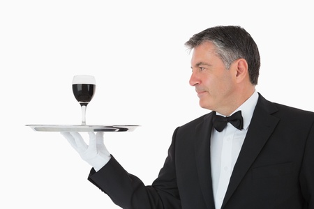 Happy waiter holding a glass full of wine on a silver tray on white background