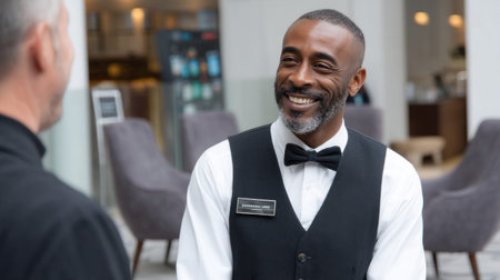 Friendly hotel concierge wearing a bow tie is assisting a guest in a modern and elegant lobby, providing exceptional customer service