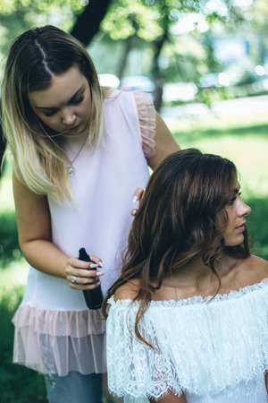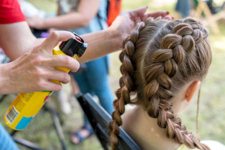 Stylist fixes curls with hairspray. high quality photo