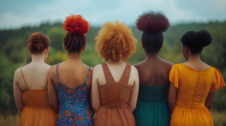 Group of young women with afro hairstyle and dresses in the field.