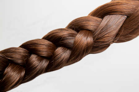 .A braid of chestnut-colored hair. The braid is made of dark brown, thick hair. On a white background. Close-up. Hair style. Hair care.