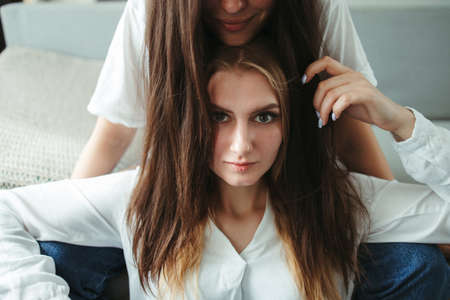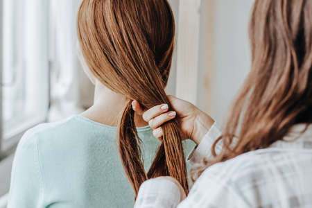 Two girls braid their hair at the window. Woman makes a braid to her friend. Hair weaving hairstyles. Girlfriend braids her hands with ringlets. Hair care
