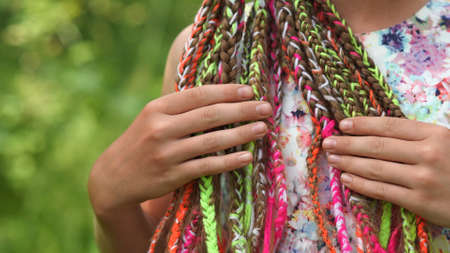 A teenage girl strokes her colorful dreadlocks with her hand.