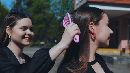 Two female students getting ready before or after school, brushing hair with pink comb, friendship and care